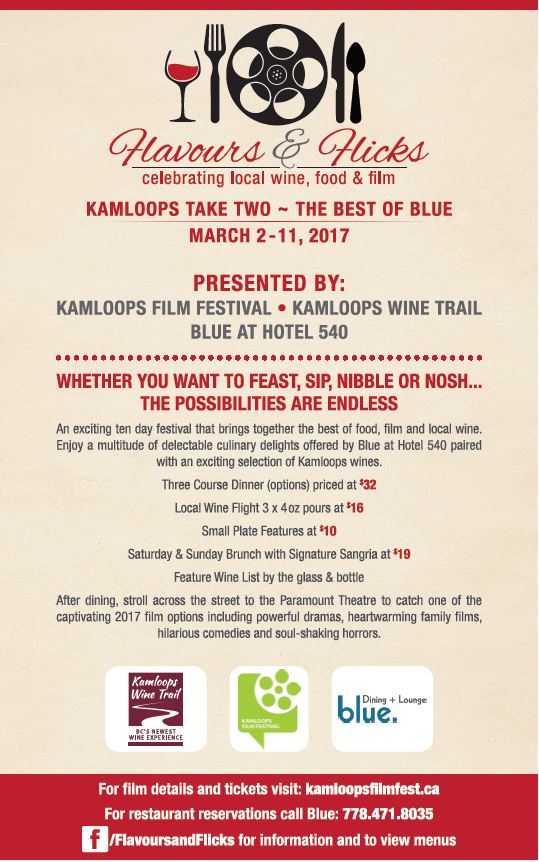 Enjoy some wonderful Flavours N Flicks during the Kamloops Film Festival with the Kamloops Wine Trail at Blue Dining + Lounge from March 2nd to March 11th.